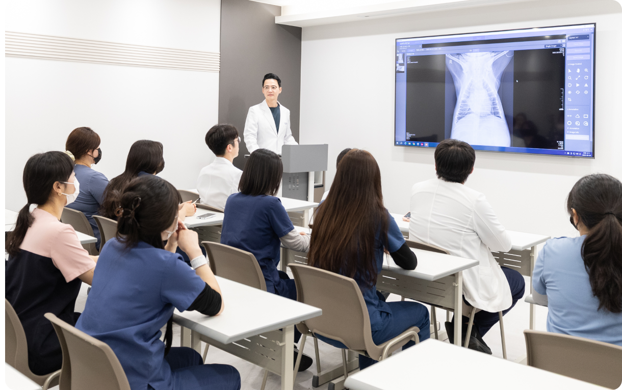 또한 대학병원 출신 수의사들을 비롯해 국내 학회는 물론 매년 최소 1회의 해외 학회 참여를 의무화해 최신 의학 지식과 글로벌 진료 트렌드를 적극적으로 반영하고 있습니다. 이는 변화하는 보호자분들의 기대와 의료 수준을 충족시키기 위함이며 끊임없이 학습하는 전문 의료기관으로서 책임이기도 합니다.
