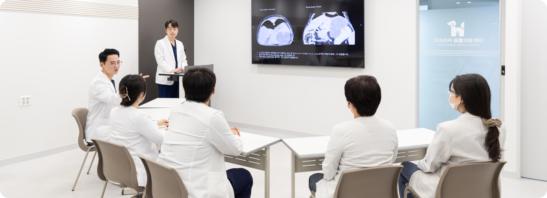 아프리카 동물의료센터 의료진은 생명 존중을 최우선 가치로 삼고, 반려동물이 ‘더 오래’가 아니라 ‘더 편안하게, 더 행복하게’ 살아갈 수 있도록 삶의 질(Quality of Life)을 중심으로 한 진료 철학을 실천하고 있습니다. 저희 센터에는 각 분야에 전문성을 갖춘 8명의 수의사가 근무하며, 내과·외과·영상진단·심장·치과·응급의학 등 다양한 영역에서 전문 임상교육, 연구 활동, 학술 세미나, 케이스 리뷰를 꾸준히 이어가고 있습니다.