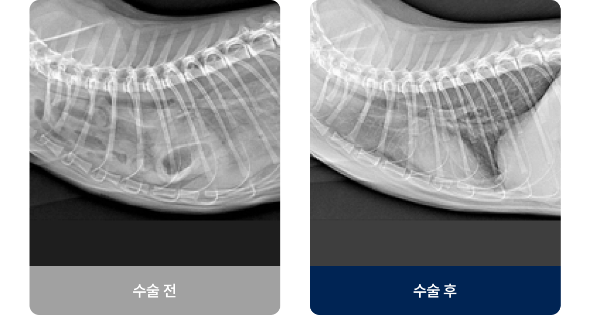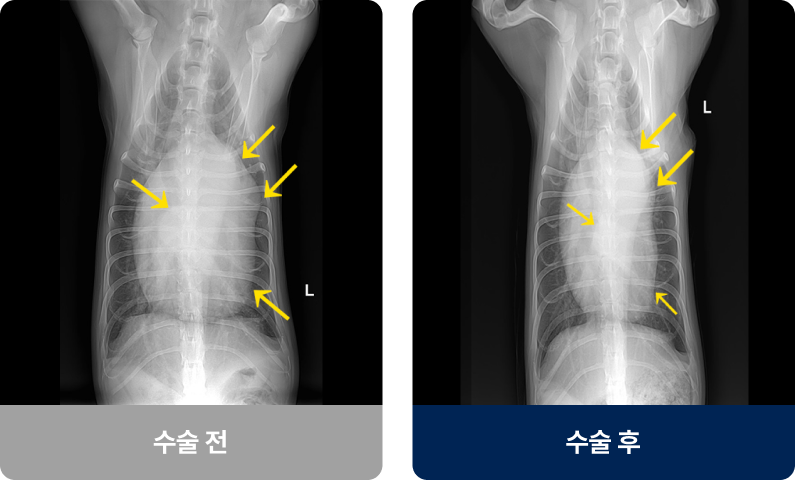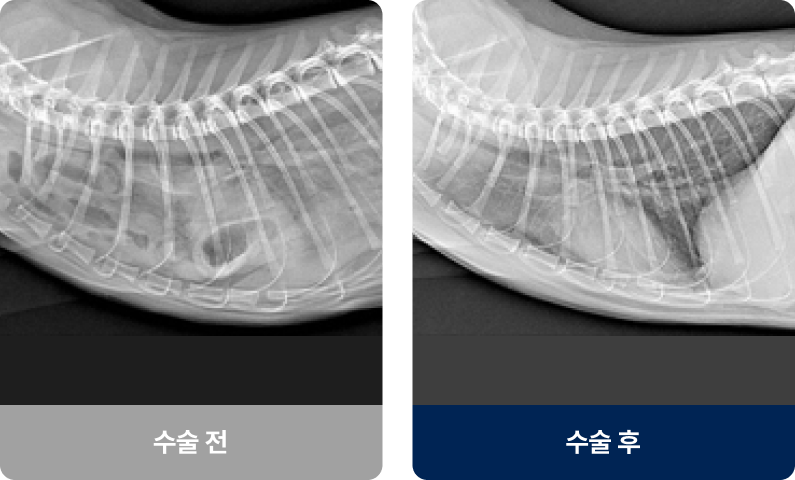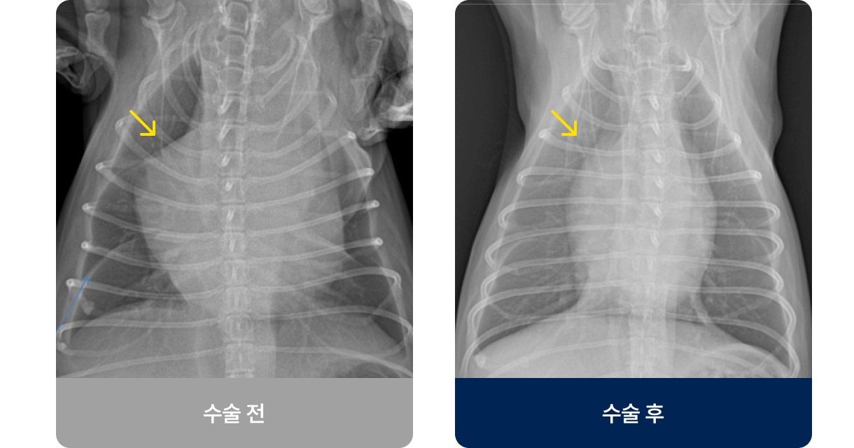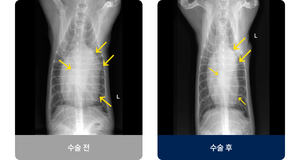PDA(동맥관 개존증), 심낭수, 횡격막 탈장과 같은 질환은 시간이 지날수록 심장 기능이 저하되고, 호흡곤란·실신·순환장애로 이어질 수 있습니다. 이 시기를 놓치면 내과적 치료만으로는 회복이 어렵고, 결국 외과적 교정이 생명을 살리는 유일한 방법이 됩니다.