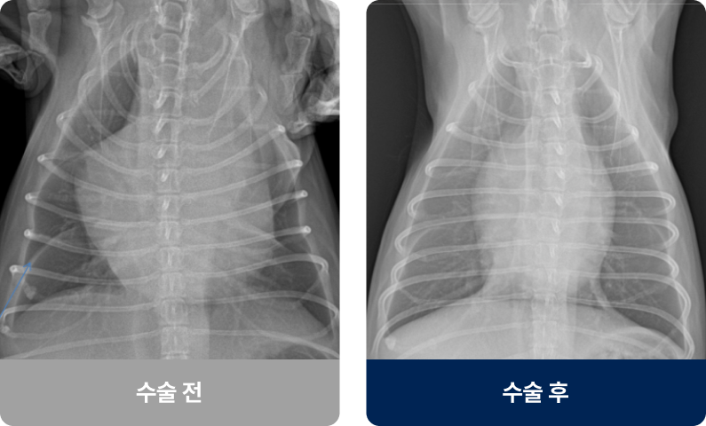 | 장점 | 심장 압박(심낭압전) 즉각 해소, 고령견·상태 불량 환자에서 가능 | 재발률 현저히 낮음, 반복 천자 필요성 감소 |