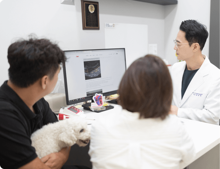 02 보호자와의 1:1 맞춤진료 초진부터 검사·진료·수술 상담까지 담당 수의사가 처음부터 끝까지 1:1로 케어합니다. 모든 질환은 보호자와 충분한 상담을 기반으로 치료 계획, 검사 목적, 예후까지 투명하게 설명합니다. 어떤 시술·수술이라도 ‘이해되는 진료’를 원칙으로 하며, 보호자의 불안함을 줄이는 것이 치료의 첫 단계라고 믿습니다.“정확한 설명과 신뢰는 결과를 바꿉니다.” |